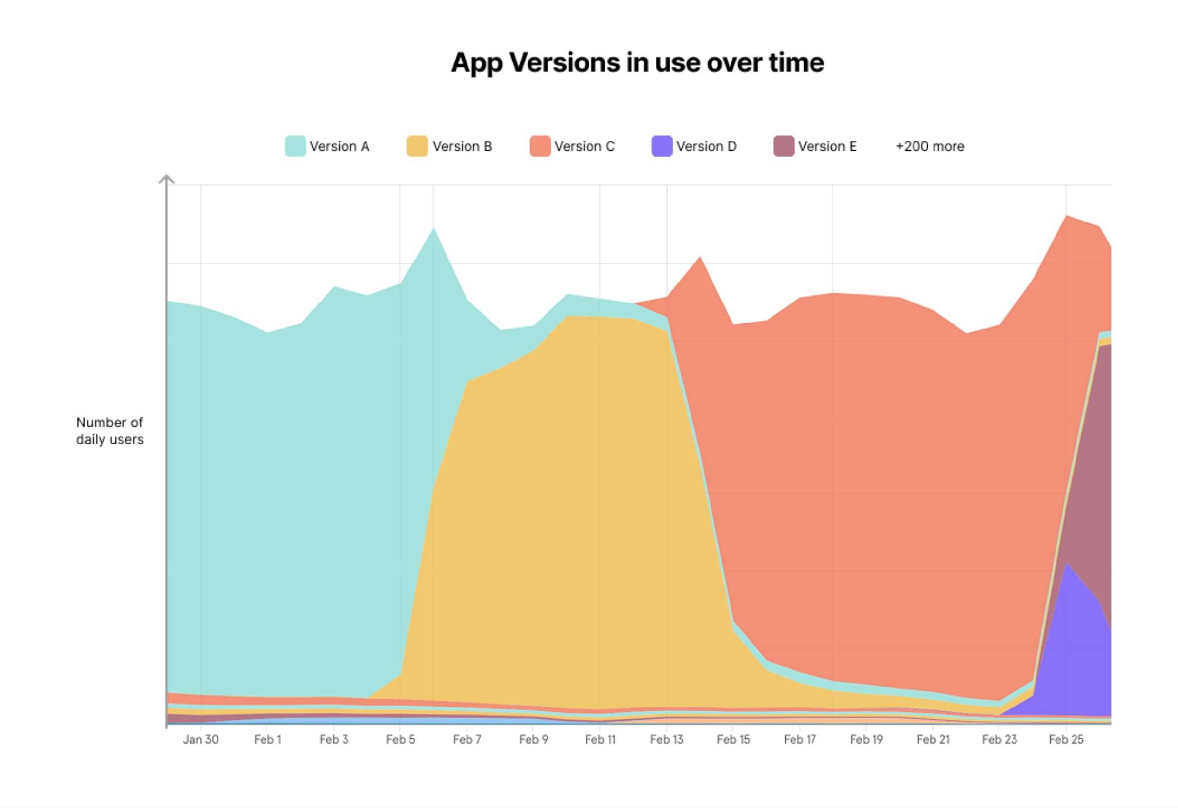 The chart shows data for a real app. Each colour represents a different version, with the iOS and Android versions grouped together. The vertical shows the number of users on each version, so the more space a version takes vertically, the more people are using it. When a new version is released, you'll see it expands out across the user base until it becomes the dominant version. It continues until another new version is released, and the whole process starts again. Let's look more closely at the detail.